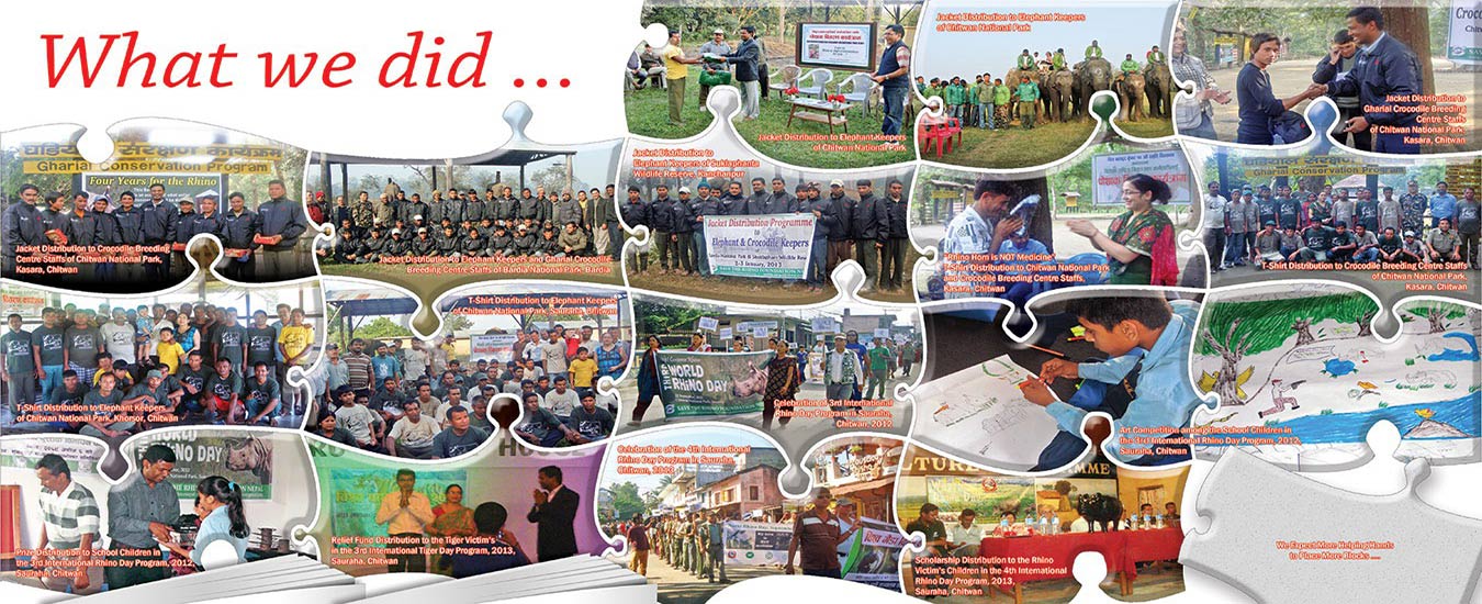 Save The Rhino Foundation Nepal (SRF) was set up to work in the area of rhino, tiger, elephant, and crocodile conservation in the protected areas. Motivating, inspiring, and encouraging the frontline staff to conserve endangered wildlife species are its main objectives. It will manage these activities from the returns from the sale of the book 'Rhino Heartbeat' penned by Kamal Jung Kunwar.