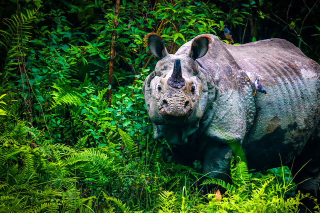 In summer days, rhinos like to wallow in the lakes, ponds, rivers and marshy mud holes. They can swim very well. While they are young, they face danger from the tigers and not so much from other animals. They can run at a speed of approximately 55 km per hour. They also have keen senses of smell and hearing. However, they do not have good eyesight. They can hardly see a hundred metres. The cattle egrets that sit on top of the rhinos eat small insects from their body and warn them of any impending dangers. They have a mutual relationship.